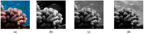 Coral images preprocessing: (a) RGB image; (b) R channel; (c) G channel; (d) B channel; (e–h) Preprocessed spectral images.