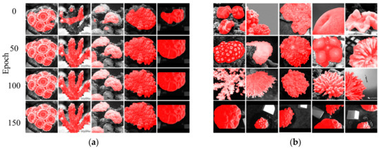 The model’s semantic segmentation is visualized at progressing epochs from 0th to 150th, and coral regions are marked with a red mask as in Figure 7a. The network showed improvement in the segmentation of validation set through continuous optimization of network parameters. The parameters of 110 epoch are selected and loaded into the segmentation model, and the validation set images verify the segmentation results. Although the shapes of corals are different, the DeeperLabC model after 110 epochs of training can fairly distinguish between coral and non-coral areas, as in Figure 7b.
