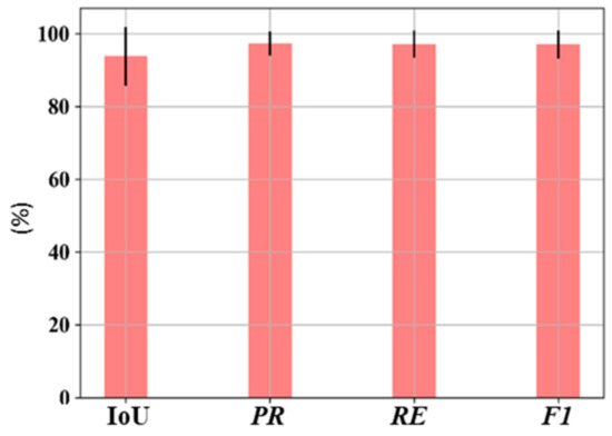 In the above equation c represents the number of classes. Since this work presents binary classification, the value of c is taken as 2. Statistical analysis of DeeperLabC is presented in Figure 8. The pink column represents each statistical index’s average value, and the black line is the standard deviation. The mean value of IoU was 93.90%, and the average values of PR, RE, and F1-score were 97.31%, 97.13%, and 97.10%, respectively.