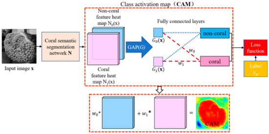 CAM module [44] is added to the DeeperLabC model’s tail to visualize the feature map of semantic segmentation. The parameters of network and CAM module are fine-tuned by using the images with category labels in the CoralS dataset. The addition of CAM to the network is described in Figure 9, where and represent a non-coral and coral characteristic thermal map of equal size, respectively. and are the average values of two thermal maps extracted by GAP as