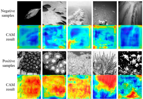 The same data set as a skeleton network pre-training is used for training, and the parameter matrix of the CAM module is adjusted to get a more accurate activation map. In CAM as in Figure 10, closer to red, shows the higher probability that the pixel belongs to coral, conversely, closer to blue represents a lower probability of belonging to coral. In the negative samples, most of the CAM areas are at a low value; while in the positive samples, the coral area has a more apparent red color, which shows that the proposed DeeperLabC model can better identify the coral features for semantic segmentation.