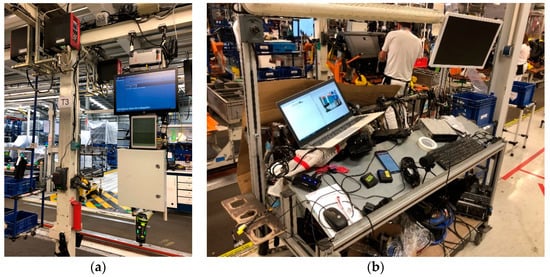 The working environment of the application is usually located in a hostile environment as far as noise sources are concerned, reaching noise values of 90 dB on a stationary basis. As described in [22], lighting and noise levels affect to human productivity in the automotive assembly industry. Typically, workers performing similar tasks and especially noise sources, generally of an impulsive nature, such as pneumatic screwdrivers, hammers, metal and plastic tools, robots, forklifts, chains and gears, coexist near the workplace. Figure 1 shows the industrial environment where the system must work. There is a continuous movement of components, accompanied by the movement of elements through the assembly line, the movement of transport trucks, the operators’ own conversations, and many more sources of noise.