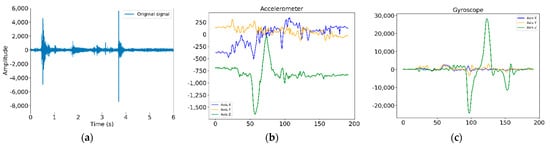 Signals: (a) acoustic signal obtained, (b) 3 axis accelerometer values obtained, (c) 3 axis gyroscope values obtained.
