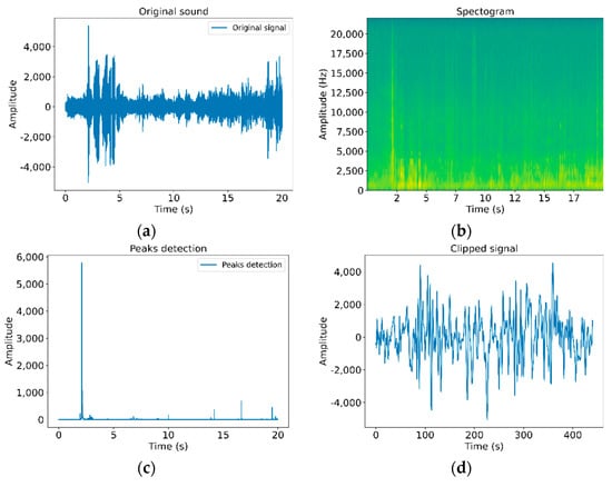 Signal processing: (a) original signal trimmed to 20 s, (b) spectrogram of the signal, (c) peaks detection, (d) signal window selected.