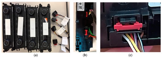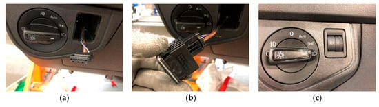 Dimmer installation: (a) connection wiring, (b) dimmer connection, (c) insertion of the dimmer in the dashboard.