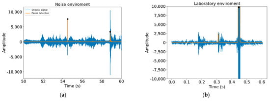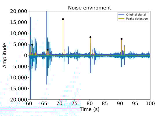 To verify the accuracy and precision of this algorithm, all connections made have been manually tagged. In this way, precise time margins have been created in which a peak should exist. This allows to check whether the peak exist at that time, which would be a correct peak, or non-present, which would be an undetected peak. Furthermore, those detected outside the margins would be directly incorrect. Figure 15 shows a 40 s audio sample, in which we can observe five correct peaks. Other peaks are observed that do not meet the conditions of detection, and then they are not labeled as clicks.