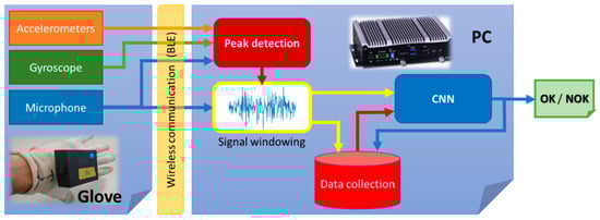 The system consists of a glove that houses the sensors (microphone, gyroscope and accelerometers), which is placed in the dominant hand, and a small industrial microcomputer that recognizes the acquired signals and provides as output the conformity or non-conformity (OK/NOK) with the performed component connection made. Since the user’s mobility takes precedence over any other criteria, the glove and the microcomputer elements are interconnected through a Bluetooth Low Energy (BLE) link, which offers the best connectivity/energy-consumption ratio. Figure 7 shows the system architecture.