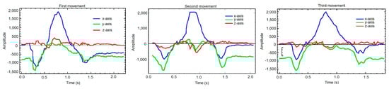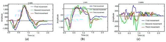 Samples overlapped by axis: (a) X-axis, (b) Y-axis, (c) Z-axis. Each graph shows the comparison between the first movement (blue), the second (green) and the third (red).