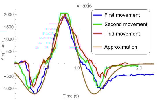 However, on many occasions it is possible to predict the behavior that a signal will have by carrying out specific studies, as we will describe below. Figure 8 shows, after filtering, transferring and scaling them properly, three samples where the operator has performed a circular twist of the wrist. As can be observed, although the different signals share a certain similarity in the waveform, the values do not match. That is, we can look for a pattern of movement that can be mathematically modeled with a function, but we must be aware that an imperfect matching will be required.