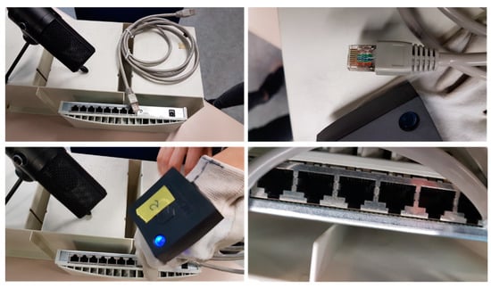 During the development process, we experienced additional difficulties when trying to acquire samples in the production plant including industrial noise. If it is usually already difficult and costly in time and effort to obtain permits to visit the plant to measure during the production process (obtaining a limited set of samples), the restrictions derived from the COVID19 pandemic caused a significant delay and forced us to build synthetic samples. For such reason, we carried out intense laboratory work to synthesize these samples, for which we used RJ-45 connectors and a network hub as shown in Figure 11.