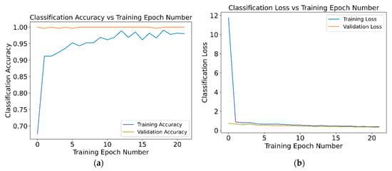 In order to determine the number of training epochs to be used in the neural network, a study was carried out with the samples of the laboratory set of the Dimmer connector. Figure 14a shows the variation between the percentage of success with respect to the number of epochs, while Figure 14b shows the evolution of classification loss with the epoch number for the validation set. Results obtained for the Climatronic network are very similar.