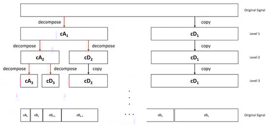 To improve the quality of the noisy signal, the denoising process should hold the real data factors and remove the additive noise components [27]. In the previous studies, the noise reduction methods are generally based on the model simulation or spectral analysis, in which it is difficult to keep the complicated features of the signal [27,51,52,53]. On the other hand, the wavelet decomposition thresholding method can control the noisy signal to maintain the original signal components and separate the noise components more precisely. In this study, the denoising method is composed of three steps as follows [54,55]: