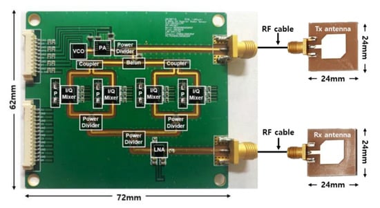 The DCG signals were detected by using the radar sensor module with two discrete patch antennas, which was implemented on an FR4 printed circuit board with a thickness of 0.6 mm, as shown in Figure 2 [43]. A total of 5.8 GHz of signals were generated by a voltage-controlled oscillator (HMC431LP4, Analog Devices) with an output power of 7.8 dBm radiating from the transmitting antenna with a directivity of 4.0 dBi. The received signals modulated by respiration and heartbeat were incident by using the receiving antenna, and they are down-converted to baseband signals by using quadrature mixers with low-pass filters with a cut-off frequency of 500 MHz. The overall noise figure in the receiver path was calculated to approximately 1.9 dB. The baseband signals were collected on a PC by using the data acquisition board with a sampling frequency of 1 kHz. Vital signs were obtained by filtering the baseband signals with a high-order band-pass filter in the digital domain. The multi-phase mixing in the radar module was used in the DC offset compensation in the received signals to improve the accuracy of the phase demodulation in signal processing [43].