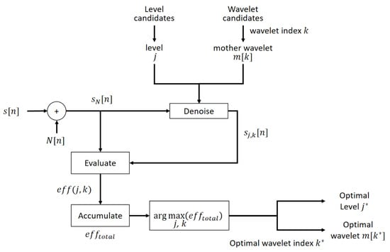 As the decomposition level and mother wavelet function have various candidates, the optimal selection not only evaluates a superior performance of denoising but also rates the execution efficiency to reduce unnecessary calculation. Table 2 and Figure 5 described the process of the optimal selection. First, the denoising process is repeated to accumulate the evaluation results for all candidates. Then, the optimal decomposition level and wavelet function index are obtained by finding the arguments of the maxima from the accumulated results. In Figure 5, denotes the optimal decomposition level and denotes the optimal mother wavelet function, where is the function index of the optimal mother wavelet.