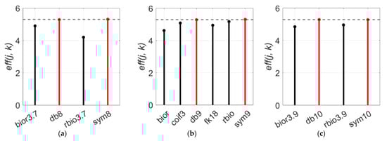 However, the wavelet length is not the only feature that represents the characteristic of the mother wavelet function. Though few numbers of the wavelet functions share the same wavelet length, the basis functions and basic features are distinctive. Therefore, even with the same wavelet length, the denoising performance will vary depending on the basis function of the mother wavelet function. At a wavelet length of 16, “db8” and “sym8” scored 5.28 and 5.31 which are higher than other wavelets and the average performance of a wavelet length of 16 is 4.92 (Figure 7a). In the case a wavelet length of 18, “db9” and “sym9” perform better again (Figure 7b). For a wavelet length of 20 (Figure 7c), “db“ and “sym” are always the optimal wavelet functions. On the contrary with the Daubechies and Symlets families, the function from the Biorthogonal family shows the lowest performance at all three graphs.