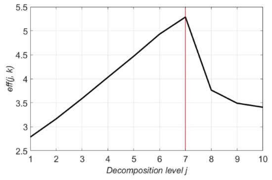 where is the wavelet coefficient of the decomposed noisy signal [65,66] and is the universal threshold value proposed by Donoho and Johnstone [51,67]. is the number of samples in the signal and is the median absolute deviation of the wavelet coefficients. The meaning of is the estimate of the standard deviation of the noise. Following these equations, the threshold value is produced with the median value of the wavelet coefficients and the number of the sampling ratio in the signal.