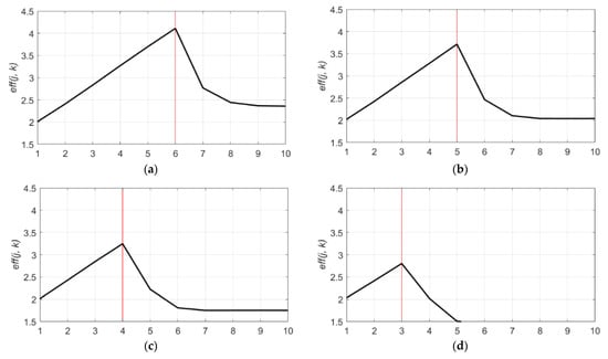 values of 10 decomposition levels (1 to 10) for db9. (a) values for a sampling frequency of 500 Hz; (b) value for a sampling frequency of 250 Hz; (c) values for a sampling frequency of 125 Hz; and (d) values for a sampling frequency of 62 Hz.