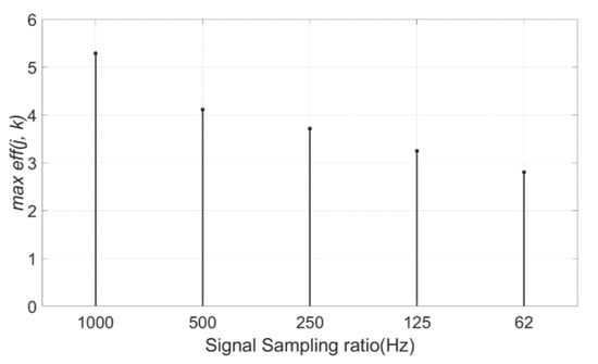 Maximum values of signals with five sampling ratios (1000 Hz, 500 Hz, 250 Hz, 125 Hz, and 62 Hz).