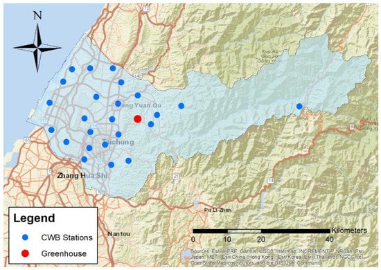 In this study, the temperature data collected from the sensors and the weather stations from the Central Weather Bureau (CWB) were utilized for the spatio-temporal kriging (http://e-service.cwb.gov.tw (accessed on 5 March 2021)). There were 24 weather stations, the locations of which are indicated by the blue points in Figure 1. The study area was located in the Xinshe District in Taichung City, indicated by the red point. The distance between the greenhouse and the nearest weather station is approximately four km while the farthest weather station is located 48 km from the greenhouse.