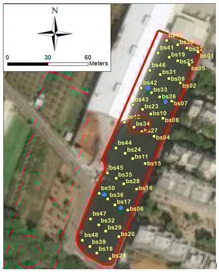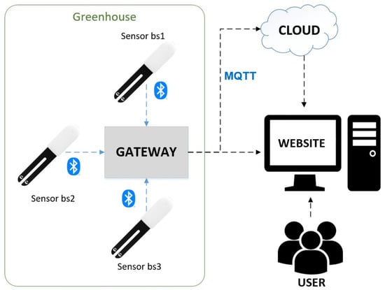 The system consists mainly of three main parts: user interface, gateway, and sensor nodes. Figure 2 shows the system structure that illustrates how the environment monitoring system for the greenhouse operates. The sensors, each of which are numbered, are uniformly distributed and deployed throughout the greenhouse to collect environmental information such as temperature, luminosity, and humidity. The data collected by the sensor nodes are transmitted to the gateways via Bluetooth. This study follows the concept of a star network topology where the gateways are deployed in the center of the greenhouse and used to collect the data from sensor nodes, store the data, process, and integrate data [15]. In addition, the gateways are connected to a WiFi network and use a message queuing telemetry transport (MQTT) protocol to transfer data from the gateway to the cloud. The user interface, which is a cloud-based web application, allows users to monitor the environmental data measured by each sensor node in real-time. Figure 3 illustrates the greenhouse with an area of approximately and the sensor’s deployment location.