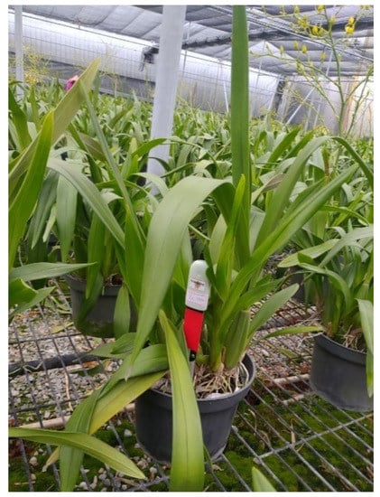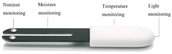 Bluetooth wireless sensors (shown in Figure 4) from the Xiaomi Corporation were installed throughout the greenhouse (Figure 5) to measure environmental information such as soil moisture and conductivity, as well as light and temperature. This brand was chosen due to its cost-effectiveness compared to other sensors, reliability, and accuracy of up to 0.5 °C. Please see https://www.mi.com/flowermonitor (accessed on 5 March 2021) for more details regarding these particular sensors. Moreover, this type is compatible with the Xiaomi Smart Home App, which means that it will be more convenient for farmers. The parameters of these sensors are shown in Table 2. Regarding battery life, in normal circumstances the battery life could exceed one year if the measurement data is stored only once every 20 min to the receiver (the default scan interval is 1200 s). However, in order to ensure the consistency of the observations and prevent missing data, regular maintenance such as battery replacement was performed every three months from the time the sensors were fully operational in May 2020. It must be noted that the sensor data was set to be recorded every five minutes to reduce the missing rate, which resulted in shorter battery life.
