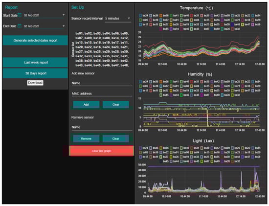 The data collected by the sensors were uploaded to a website and downloaded using a computer, the layout of which is shown in Figure 6. For example, real-time environmental data including temperature, soil moisture, and luminosity is displayed from top to bottom. Each collection sensor is assigned its own color, which makes it easier to determine if a particular sensor is not functioning correctly. The middle panel of the platform is where the management and setting interfaces are located, to which sensors can be added or removed and where the time intervals for recording the environmental components can be set. As previously stated, for this study, the intervals were set to five minutes. The sensor data for a specific date can be downloaded on the left panel. The white section at the bottom is for downloading, and the start and end dates are displayed in the blank section at the upper left corner of the screen.