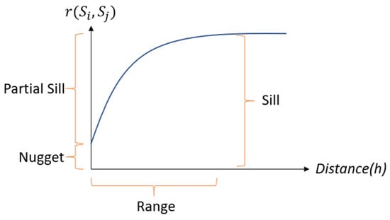 The illustration of the semi-variogram is shown in Figure 7. The x-axis in Figure 7 represents the distance h, the y-axis is the semi-variance, and it shows that the model levels out at a certain distance. The range is the distance where the model first flattens, the value at which the semi-variogram model attains the range (the value on the y-axis) is called the sill, the nugget is the intercept on the y-axis when the distance equal to 0, and the partial sill is the sill minus the nugget. According to McBratney and Webster [16], the semi-variogram value will be 0 when the separation distance is also equal to zero. However, at an extremely small distance of separation, the semi-variogram usually shows a nugget effect higher than 0. The nugget effect could be attributed to spatial variance or measurement errors at distances shorter than the sample interval. Measurement error occurs due to an error underlying in the measurement instrument. Natural phenomena could still vary spatially across a variety of scales. Microscale variations smaller than the sample interval will appear as part of the nugget effect.