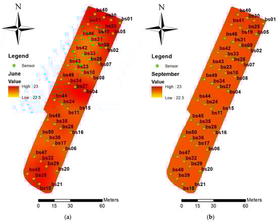The kriging results illustrate the temperature variations in the greenhouse that were recorded using sensors, as shown in Figure 8. The average temperatures on July 14th from 12:00 a.m.—00:55 a.m. (Figure 8a) and on September 14th from 12:00 a.m. —00:55 a.m. (Figure 8b) were utilized as the sample, which as shown in the legend, and measured in degrees Celsius. As seen in Figure 7, the average temperatures in July, especially in the northern, middle, and southern sections of the greenhouse, were slightly higher than those in September, which was expected. Furthermore, there were fewer variances in September than in June, largely because there were more missing data on September 14th than on June 14th. Since in this study the missing data were filled in with the averages of all sensor measurements, the temperature distribution, shown in Figure 8b, was less than that in Figure 8a.