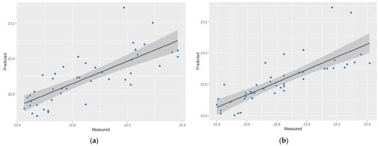 Validation is crucial for evaluating a model’s robustness and performance. For this study, the R-square and RMSE values from the results of the k-fold cross-validation were utilized as the parameters to evaluate the kriging from the sensor observations [17]. Figure 9 shows scatterplots of the observed and predicted temperatures (based on 95% prediction intervals). The kriging consistently performed well in both seasons with R-squares of 0.59 and 0.62 (RMSE 0.3, and 0.19) in summer (Figure 9a) and autumn, respectively (Figure 9b).