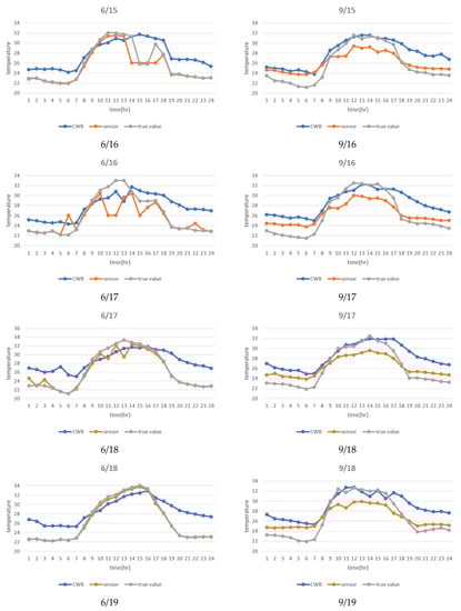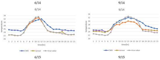 In addition, the true value and the two estimators were plotted on the graphs below to compare the differences in the results between June and September. Figure 9 shows the line chart of the true and the predicted values based on the weather station and sensor data. The blue line is the predicted value from the weather station data, the orange line is the predicted value from the sensor data, and the gray line shows the observed value from sensor bs34 (real value). The x-axis is the time, and the y-axis is the temperature. As shown in Figure 10, the sensor data prediction on June 14th—20th was closer to the true value than the one on September 14th—20th. During this week, the weather station data prediction was a bit higher than that from the sensor data.