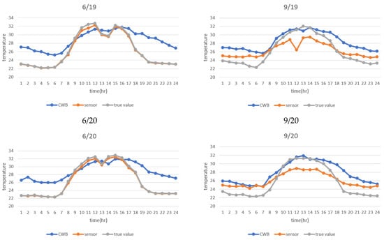 As shown in Figure 10, the trend of the predicted value from the sensor data and true value were similar on June 14th—20th. The RMSE and MAE were also similar. Moreover, the prediction based on sensor data in June was more accurate than the one in September. On June 14th—20th, the prediction based on weather station data was a bit higher than that from the true value and sensor data, except from 9 a.m. to 12 a.m. As indicated in all figures, most of the predictions from sensor data were lower than those from weather station data. The possible reason is that several fans are installed in the greenhouse and only operated during summer. When the results in summer (June) and autumn (September) were compared, there were no obvious differences between them. Moreover, there was a more significant difference between that from the sensor estimator and the true value at noon (11 a.m. to 12 a.m.) than from the CWB estimators on 6/17 and 9/20. The possible reason is that the daily average was used to fill the missing value at and these two days have more missing values than usual.