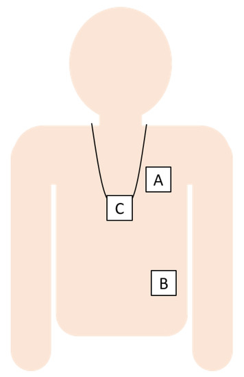 The sensor locations were the left chest (A), left lower rib (B), and pendant (C).