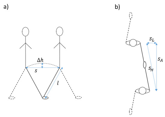 We updated the method to account for lateral movements in the step trajectory in order to improve estimates for slow walking speeds. First, step lengths become small in slow walking [14], which makes the effect of lateral movement on the height changes more prominent. To correct for this, we assumed that the circular trajectory of the CoM during a step consists, horizontally, of an anterior and a lateral component, the Euclidian length of which, or the horizontal step length, determines the height change. Thus, in order to account for the lateral movement, we subtracted an estimate of the distance of lateral movement from the estimated horizontal step length in a quadratic way as , where is the anterior (or forward step length) and is the horizontal step length. The lateral movement was estimated as 5.4° or 0.094 times the leg length l [15]. Figure 2 shows the variables that were used in the IP model and in the updated model, including the addition of lateral movement (Figure 2b), and Figure 3 shows the signals at the different stages of the algorithm.