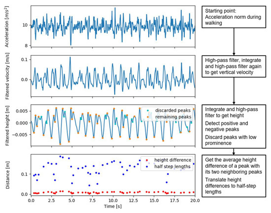 Secondly, due to movement variability, additional peaks may disturb the limited height changes in slow walking, leading to more than one positive and one negative height peak appearing per step. The additional peaks, even if they are small, can substantially increase the summed step lengths, due to the non-linear relation between height change and step length. Therefore, we filtered peaks by a minimum prominence. The threshold for the minimum prominence was set to , which is equal to a height change that corresponds to a forward step length , given the subtraction of the estimated lateral movement distance .