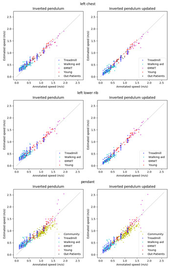 At the higher walking speeds of above 1.6 m/s that we measured in the 6MWT in healthy volunteers, the spread as compared to reference speeds was larger for both the original and updated IP method for the pendant position, which resulted in lower accuracies. This could be due to the swinging of the pendant at these higher speeds. While this is something to keep in mind when choosing a wearing position and algorithm for walking speed monitoring for a specific application, walking speeds that are above 1.6 m/s may not be relevant for monitoring health in older community and patient populations. Nevertheless, it should be noted that, also for the Community data from older people—for which only data at the pendant location were available—the accuracy was lower when compared to other normal (i.e., without walking aids) activities, with an underestimation bias for both methods.