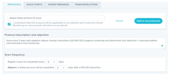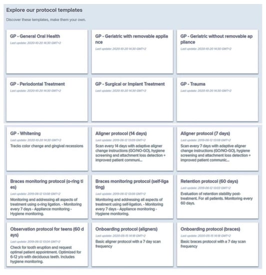 The DM has four different protocols based on the different characteristics and specificities of each protocol, from the simplest to the most complex. They are: Photo Monitoring Light (limited to two scans per month, NO clinical analysis, only self-assessment required, and message to/from patients); Photo Monitoring (2D clinical analyses, unlimited scans, dynamic replacement of aligners, “Go Live”); 3D Monitoring Light (3D calculations of dental movements and 2D clinical analyses, limited to one scan per month, incompatible with the dynamic replacement of aligners); 3D Monitoring Full (3D calculations of dental movements, 2D clinical analysis, and unlimited scans, incompatible with the dynamic replacement of aligners). There are different prices, according to the protocol: Photo Monitoring Light, 6 euro/month, Photo Monitoring, 9.90 euro/month, 3D Monitoring Light, 12.90 euro/month, 3D Monitoring Full, 15.90 euro/month. The orthodontist can also create new customized protocols for each patient.