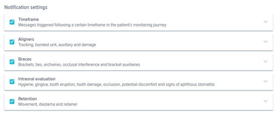 In orthodontics, DM system protocols can include the automatic detection of the debonding of braces, tubes, bands, or buttons, damage to hooks or temporary anchorage device ligatures, archwire disengagement, occlusal interferences with an archwire or a bracket, oral hygiene, soft tissues inflammation, gingival recessions, tooth damage, signs of aphthous stomatitis, dental eruption, appliance cleaning, black triangles, and stability of fixed and removable retainers.