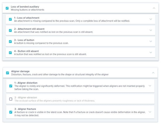 16]. It includes a training set early by bio engineering, and the DM assessment is based on it. Applying deep learning process in dentistry has taken a long time from dedicated AI engineering to optimize and collect sufficient data (millions of dental images) to feed the machines in early stages, label the images one by one, and eventually build the neural networks that make the machine semi “intelligent”. Labeling included images about various clinical situations, concerning: debonding of braces, tubes, bands, or buttons, damage to hooks or temporary anchorage device ligatures, archwire disengagement, occlusal interferences with an archwire or a bracket, oral hygiene, soft tissues inflammation, gingival recessions, tooth damage, signs of aphthous stomatitis, dental eruption, appliance cleaning, black triangles, fixed and removable retainers stability, the fit and perfect adaptability of the aligner, the presence or integrity of attachments, the presence and maintenance of buttons and elastics, and the integrity of teeth and aligners. The AI looks for these clinical situations.