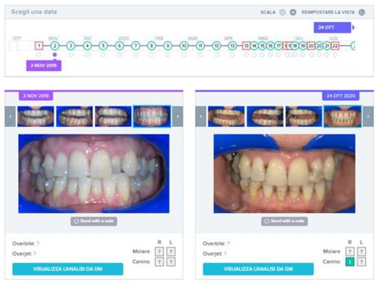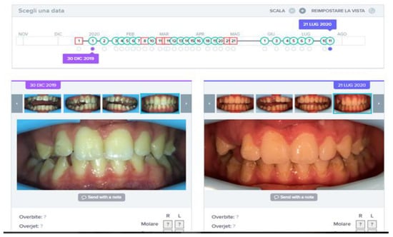 The DM system allows to monitor orthodontic treatment and improves its efficiency. It improves the patient’s motivation and compliance, it optimizes time and allows to intervene promptly in case of unexpected events, such as debonding or damage of the orthodontic device, through a constant monitoring of the therapy. The DM system allows the patients to see their mouth and therapeutic progresses whenever they want. Furthermore, a continuous interaction between the patient and the orthodontist is possible; the orthodontist can ask the patient for an immediate scan, send them a message, or give them clinical instructions. This gives the patient a sense of constant “care” and maximum availability from the orthodontist and makes them feel they are a participant in their orthodontic treatment. In the present case of an adult patient, the communication allowed to immediately obtain explanations about the necessity to continue to wear the same aligner, which happened when the patient received the No Go communication. Other communications allowed to immediately clarify procedures about hygiene, aligner cleaning, and pain during treatment.