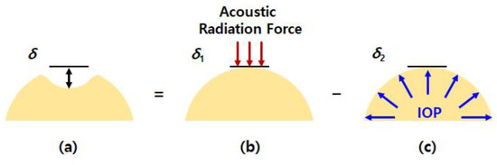 Schematic diagrams of the operational principle of the proposed technique: (a) final deformation δ is equal to the difference between (b) deformation δ1 by the acoustic radiation force and (c) deformation δ2 by the IOP.
