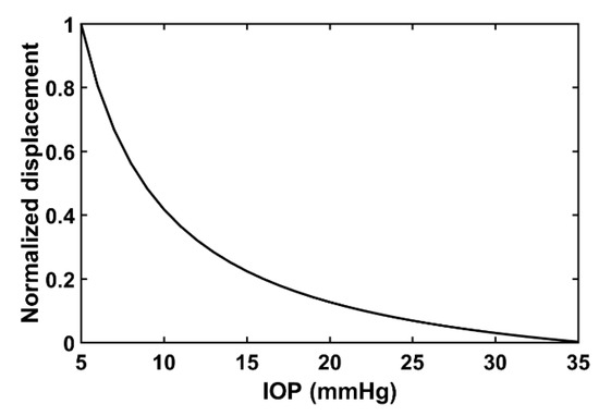 Relationship between normalized displacement obtained by Equation (9) with assumed values and desired IOP range.