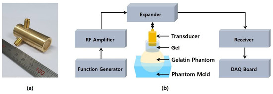Figure 4b shows the experimental setup to generate and observe the displacement change depending on elasticity of the phantom. The input signal was generated by a function generator (33600A, Keysight Technologies, Santa Clara, CA, USA) and amplified by an amplifier (100A400A, Amplifier Research, Souderton, PA, USA). The amplified signal was applied to the transducer and the reflected echoes were obtained by a receiver (5073PR, Olympus IMS, Waltham, MA, USA) with a 20 dB gain. The received signals were acquired by a data acquisition (DAQ) board (CS121G2, GaGe Applied Technologies Inc., Lachine, QC, Canada). The DAQ board was controlled by a LabVIEW (National Instruments., Austin, TX, USA) software program. Data collection on each phantom was repeated ten times in the same experimental environment.
