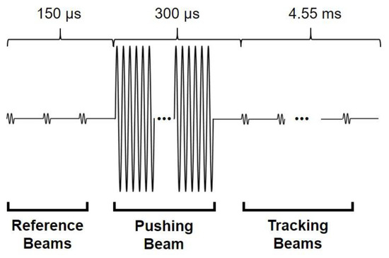 Schematic diagram of the input sequence composed of reference beams, pushing beam, and tracking beams used in experiment. The reference and tracking beams consist of 2-cycle sine wave, and the pushing beam consists of 500-cycle sine wave.