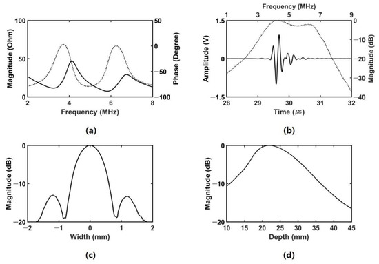 The electrical impedance was measured using an impedance analyzer (4294A, Keysight, San Jose, CA, USA). The resonance and anti-resonance frequencies were 3.25 MHz (11.44 Ω) and 4.15 MHz (46.82 Ω), respectively, as shown in Figure 6a. Figure 6b shows the pulse-echo response results. The center frequency and -6 dB fractional bandwidth were 5.11 MHz and 67.51%, respectively. The axial and lateral beam profiles were measured using 4-cycle 5-MHz sinusoidal wave. The −6 dB lateral and axial beamwidths were 0.98 mm and 17.1 mm, respectively, as shown in Figure 6c,d.