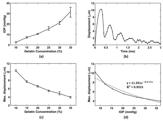 The reason for using the gelatin phantoms in this study is to ensure that the axial displacement, which can be simultaneously generated and measured by the acoustic radiation force, has correlation with the IOP values or not. In order to achieve this goal, experimental targets with gradually changing IOP values were required, the gelatin phantom capable of changing property was the proper target. Moreover, the gelatin-based phantom is a commonly used target for validation experiments for measuring elasticity or mimicking the structure of corneal tissues [52,53,54]. In this regard, we conducted experiments with the gelatin phantoms for the feasibility validation of our proposed technique. We will try to find a way to gradually change the IOP value of the in-vitro target as the further work. In this experiment, the increase amount in the concentration of the gelatin phantom was determined by considering the range of human IOP. If the error range of the rebound tonometer used in the experiment and the concentration uniformity error of the hand-made gelatin phantom in the laboratory can be reduced, the increase amount in concentration of the gelatin phantom can be more reduced resulting in the increased IOP resolution.