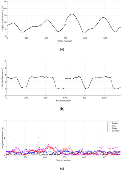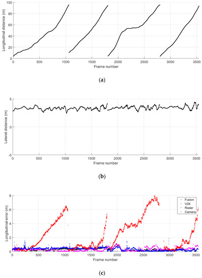 Figure 10a,b show the ground truth distance to the remote vehicle obtained for the driving scenario where both vehicles are in the same lane. The longitudinal and lateral relative distance obtained from separate test runs are concatenated and presented together. The time step between two consecutive frames from the same test run corresponds to 0.1 s. The separation between the two test vehicles gradually increases while both vehicles stay in the same lane. The absolute error for the relative position in the longitudinal and lateral directions is presented in Figure 10c,d. The results of the proposed data fusion method are presented along with those of individual remote sensing systems. Despite the fluctuations observed in the position estimates of the radar, camera, and V2X communications, the proposed method enables reliable estimation of the relative position of the remote target at varying distances.