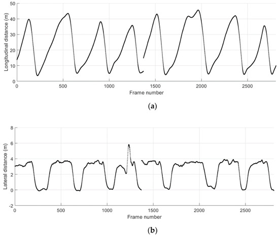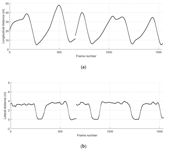 The results obtained when the target vehicle is at a relative longitudinal distance of 70 m or longer are not used for this performance evaluation, considering that the lateral position accuracy of the GNSS system used for ground truth degrades at such long distances due to the limited heading accuracy such that it may not be appropriate to be utilized as a reference system. In addition, the Mobileye camera used in this work appears to suffer from significant degradation in longitudinal accuracy for remote targets located at such distances.