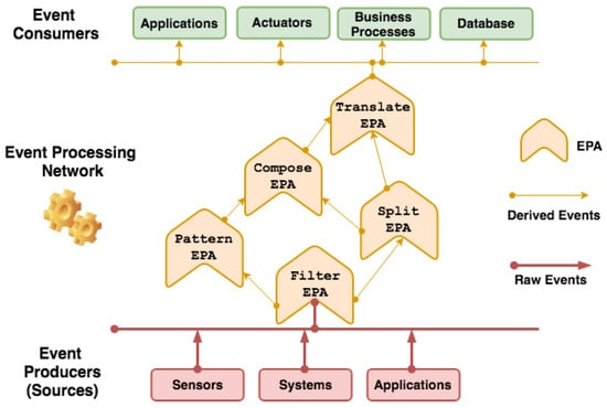 In IoT, there is a multitude of information flows, computer-based human collaborations, electronic businesses, and interactions with software agents that continuously generate a large amount of data. Platforms developed for IoT demand a massive amount of interaction flows that indicate some aspects of Big Data, such as volume, speed, variety, and veracity (or especially uncertainty) of data [8,11]. IoT applications have benefited from using event processing structures to consume information flows from various sources and derive situations. An example is the structure of the Event Processing Network (EPN) presented in Figure 1, where events are created by producers, which are entities (e.g., sensors and client applications) that generate occurrences of interest to IoT applications.