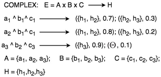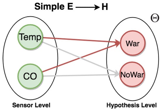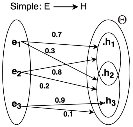 We present methods to represent uncertainty in CEP rule descriptions using graphs and semi-graphs (by semi-graphs means that both graphs and uncertain relation statements are used together for representation) [65,66,67] for a given domain problem. In Figure 4, the frame of discernment and relations can be represented as graphs, so consisting of nodes connected by directed edges. By using graphs, it is possible to add, in a simple manner, uncertain relations directly between the evidential space and the hypothesis space .