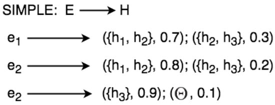 By definition, the DST requires that the sum of the masses attributed to the hypothesis of interest to be equal to one. Formally, if represents any element of , then is satisfied according to Equation (1).